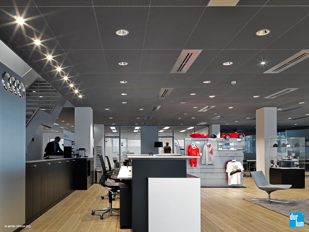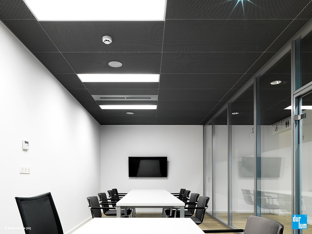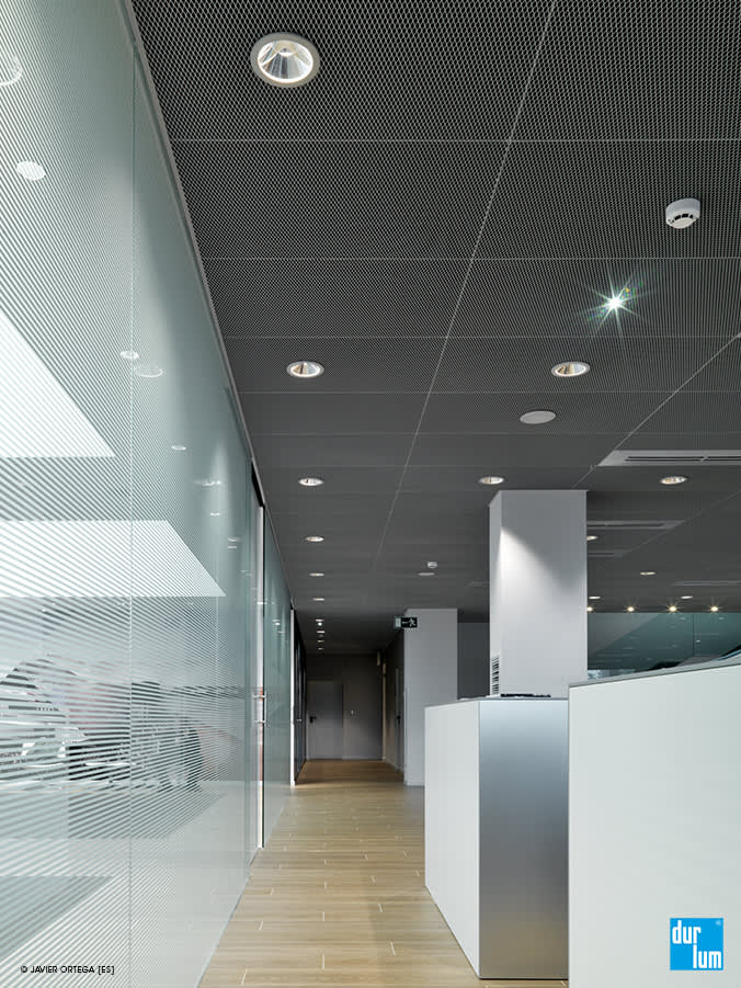 The expanded metal ceiling RHOMBOS of durlum are versatile elements for the interior decoration. Depending on the mesh size, they make the ceiling appear light, transparent or very closed. The form of the mesh and the expanded metal color are additional elements for achieving an architecture that takes your requirements and concepts into account. The RHOMBOS expanded metal product range is particularly suitable for the following applications: schools, airports, railway stations, shopping centres, sport facilities, offices, hotels, industrial facilities etc. We offer expanded metal panels primarily as suspended ceilings. As manufacturer of ceilings and lighting fixtures, we can offer ceiling systems in which ceiling and lighting are ideally matched to each other. Our expanded metal ceilings RHOMBOS are acoustically neutral between 250 and 4000 Hz , however they can also be provided as acoustical ceilings with black acoustic fleece. On request, we develop solutions for the application of expanded metal fro wall coverings, as vaulted ceilings , as chilled/heated ceilings and as ceiling panels [maximum size: 1100 x 2500 mm].