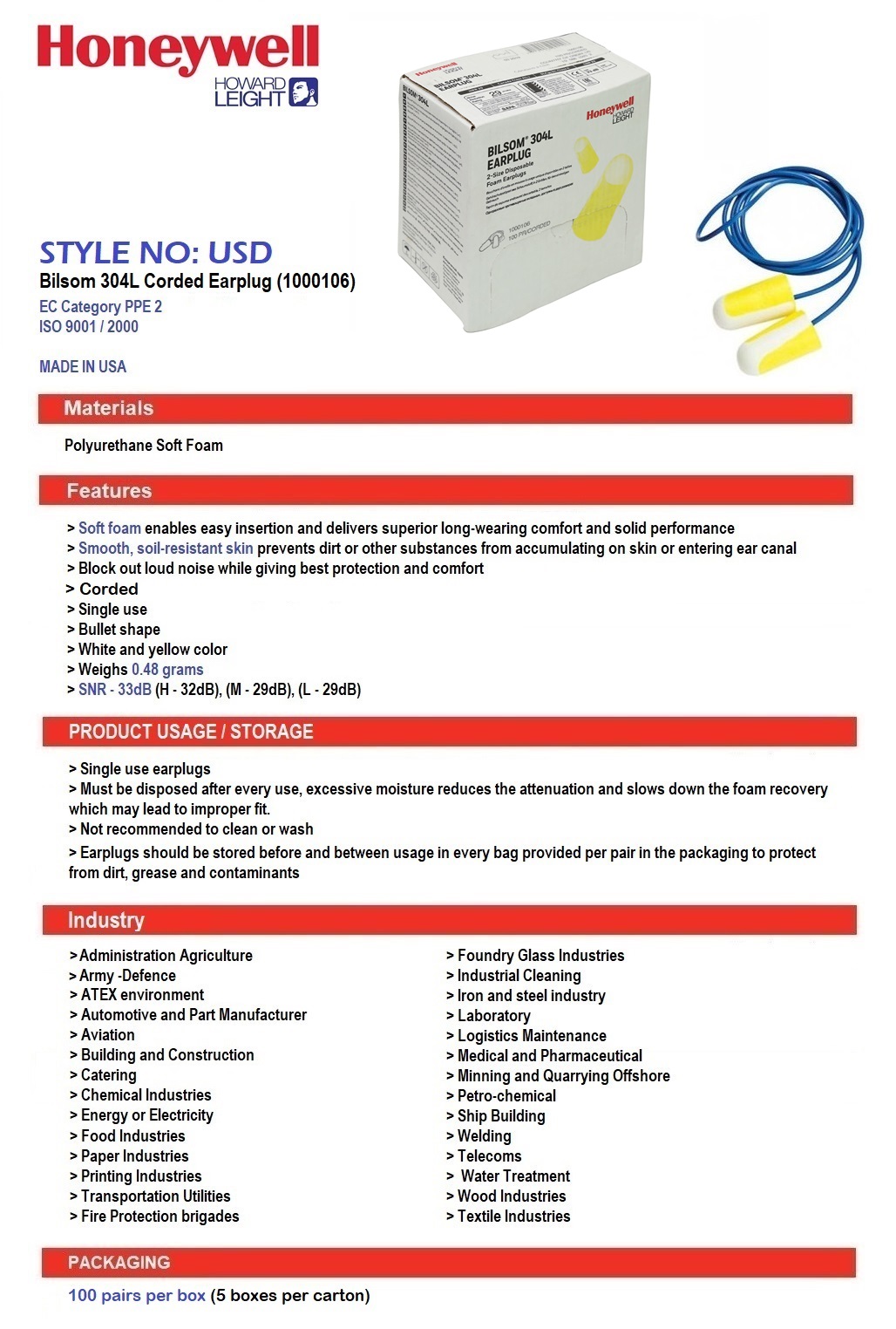 Ear Plugs also known as Bilsom 304L Foamplug (Corded) which is used to be inserted in the ear canal to protect the user's ears from loud noises, intrusion of water, foreign bodies, dust or excessive wind. Benefit are Bilsom 300 Series earplugs are ideal for workers who need to block out loud noise and demand the best protection and comfort available in an earplug. Europe's most-used polyurethane earplug, the 300 series earplug, offers superior noise-blocking performance in a single-use earplug.