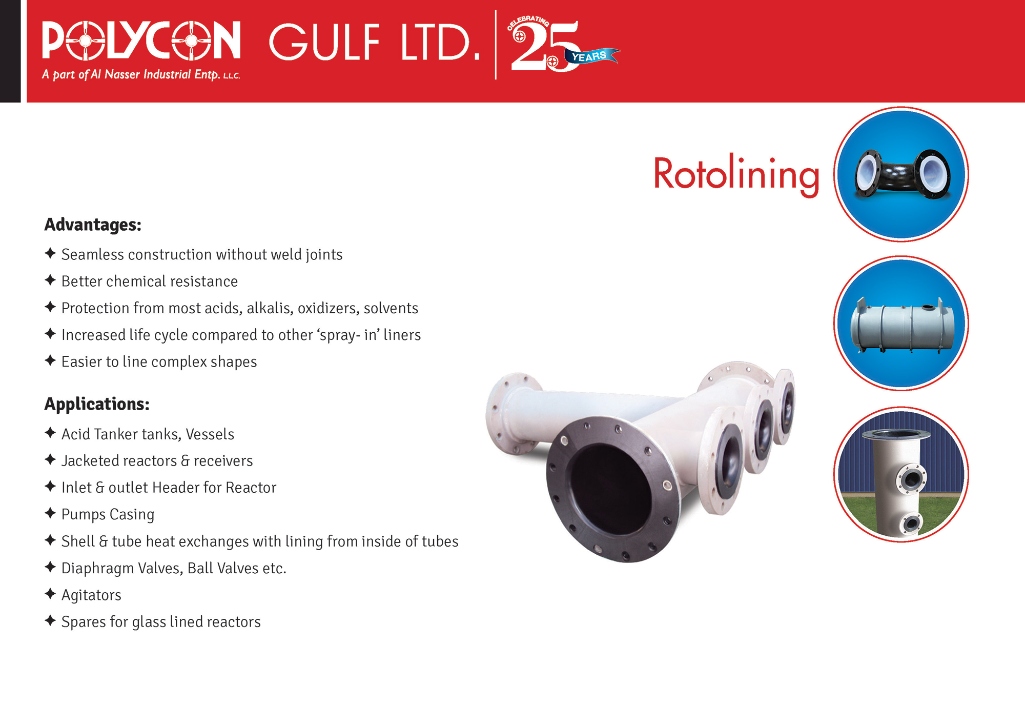 A seamless Polymer Lining technique for carbon steel pipes, fittings and vessels. Rotolining is a unique process that has recently seen significant advantages in part complexity and material performance. This technique allows for a seamless polymer lining to be applied to the interior surface of metal structures. The use of high performance thermoplastics in Rotolining assures that this process will continue to grow and be accepted as an industry standard.