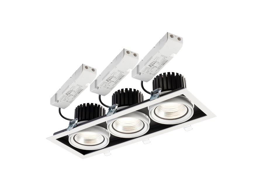Accent Downlight Expospot 90 Cardan are the Integrated LED gimbal accent downlight, ideal for retail and display applications, die-cast aluminium body, passive cooling, optics: aluminium reflector and lens combination, total fixture output:3 x 2855lm, LOR: 100%, colour rendering: Ra 90 typical, LED Chromacity: 3 step MacAdam ellipse, lifetime: 60,000 hours at 70% of the original output (L70B50), energy class: A++, A+, A, IR/UV free light source without heat radiation, electronic driver, non-dimmable, electrical protection: CLASS II.