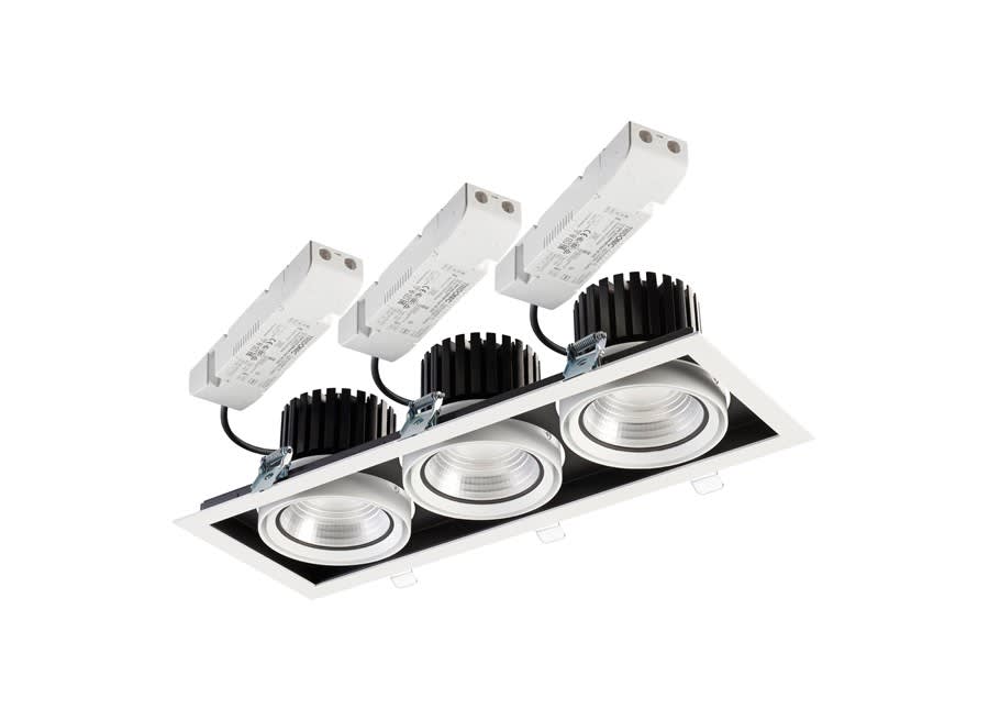 Accent Downlight Expospot 90 Cardan are the Integrated LED gimbal accent downlight, ideal for retail and display applications, die-cast aluminium body, passive cooling, optics: aluminium reflector and lens combination, total fixture output: 3x3721lm, LOR: 100%, colour rendering: Ra 80 typical, LED Chromacity: 3 step MacAdam ellipse, lifetime: 60,000 hours at 70% of the original output (L70B50), energy class: A++, A+, A, IR/UV free light source without heat radiation, electronic driver, non-dimmable, electrical protection: CLASS II.