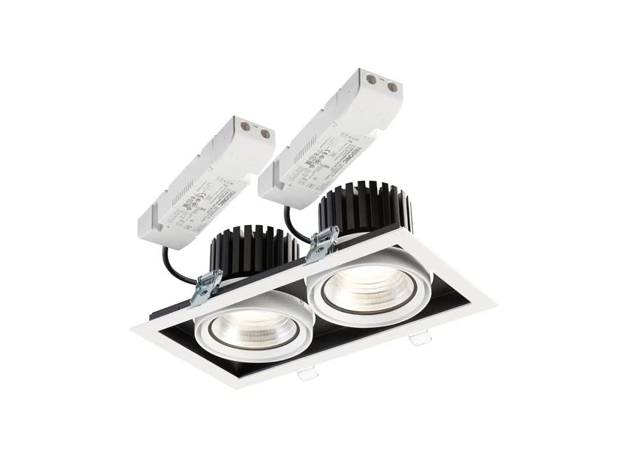 Accent Downlight Expospot 90 Cardan are the Integrated LED gimbal accent downlight, ideal for retail and display applications, die-cast aluminium body, passive cooling, optics: aluminium reflector and lens combination, total fixture output: 2x2855lm, LOR: 100%, colour rendering: Ra 90 typical, LED Chromacity: 3 step MacAdam ellipse, lifetime: 60,000 hours at 70% of the original output (L70B50), energy class: A++, A+, A, IR/UV free light source without heat radiation, electronic driver, non-dimmable, electrical protection: CLASS II.