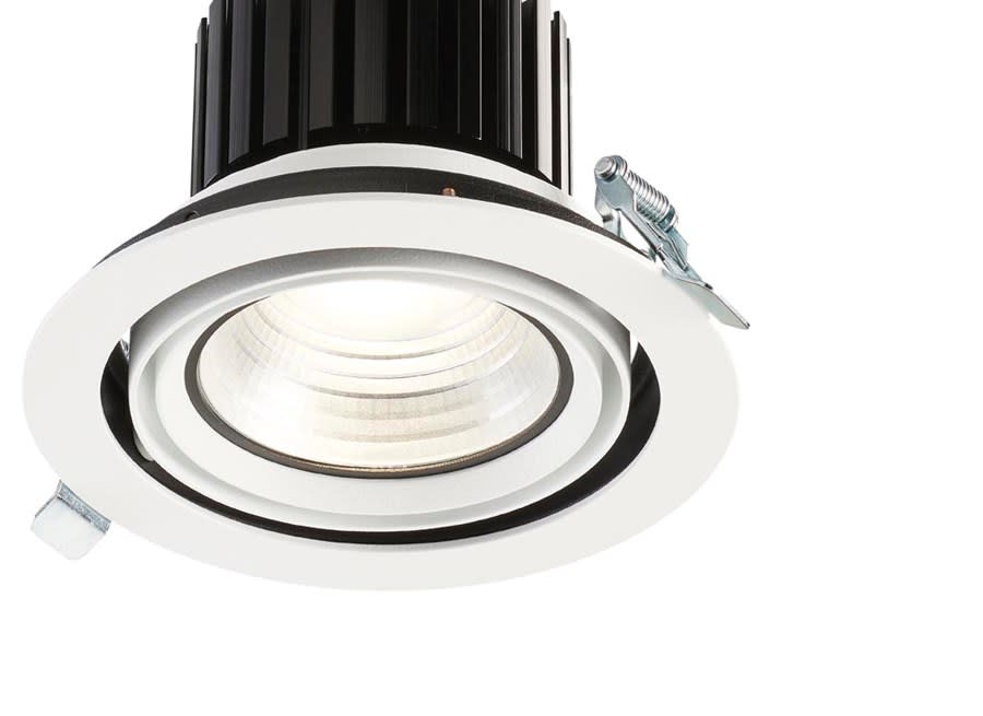 Accent Downlight Expospot 90 Cardan are the Integrated LED gimbal accent downlight, ideal for retail and display applications, die-cast aluminium body, passive cooling, optics: aluminium reflector and lens combination, total fixture output:3946lm, LOR: 100%, colour rendering: Ra 80 typical, LED Chromacity: 3 step MacAdam ellipse, lifetime: 60,000 hours at 70% of the original output (L70B50), energy class: A++, A+, A, IR/UV free light source without heat radiation, electronic driver, non-dimmable, electrical protection: CLASS II.