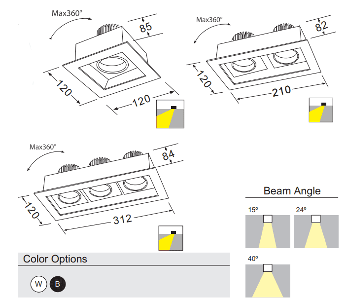 | Beam Angle (°) | 15, 40, 24 |