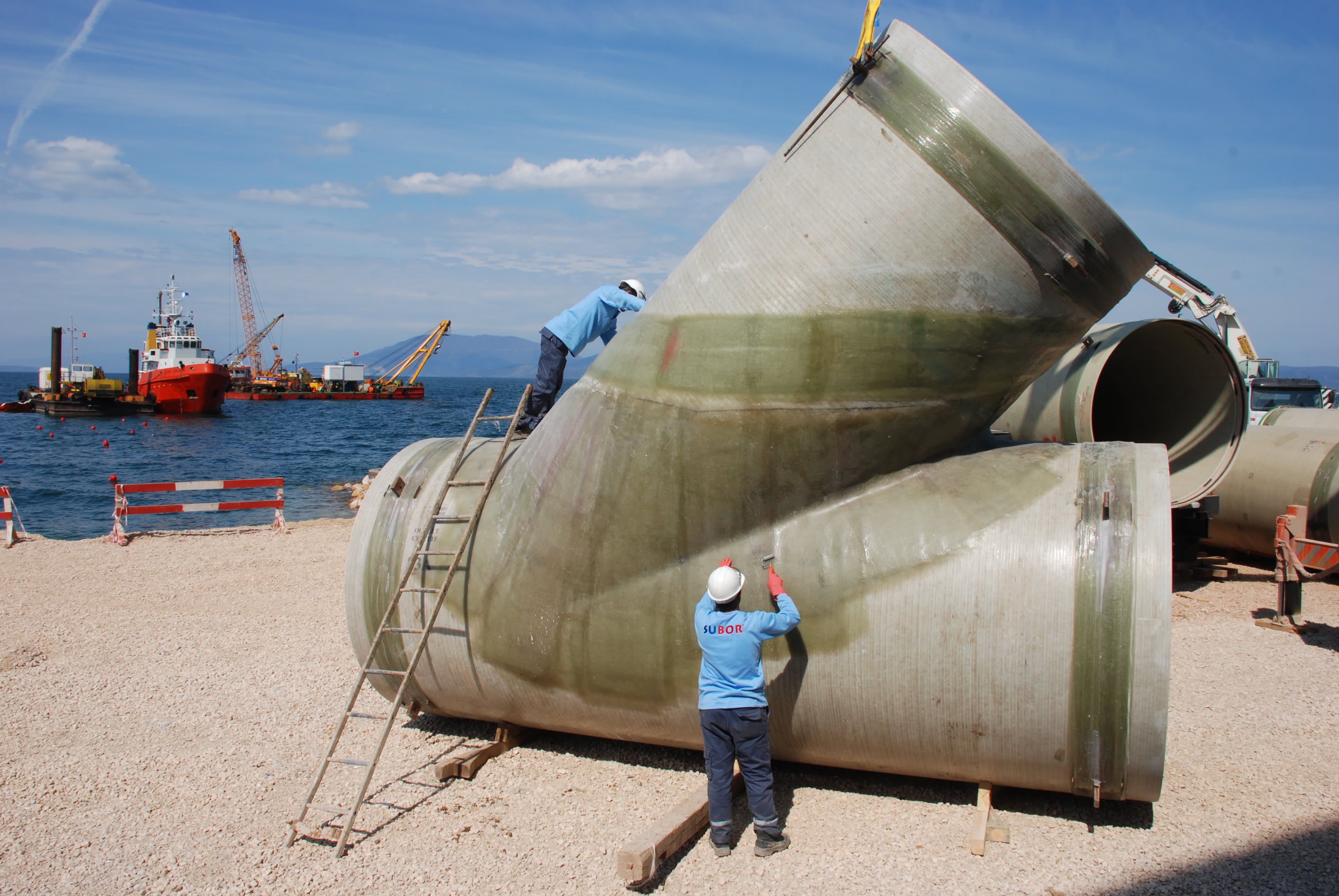 For fitting production, pipes are first cut at the desired angles and forms. The cut pipes are attached by connecting glass fiber mat (CSM), glass fiber webbing-lattice (WR), and glass fiber multiaxial materials to each other by polyester recin.