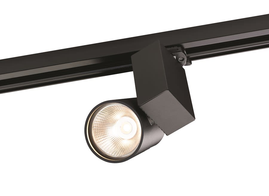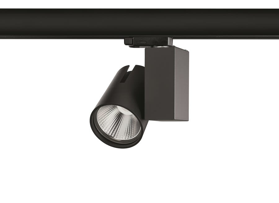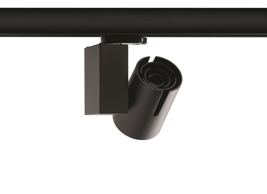 Spotlight Start Track Small is an integrated LED spotlight, Textured Black - RAL9005, compact and minimalist design, ideal for retail applications, die-cast aluminium body, passive cooling heatsink. Global Track 3 Phase adapter suitable for Global trac 3-circuit tracks.